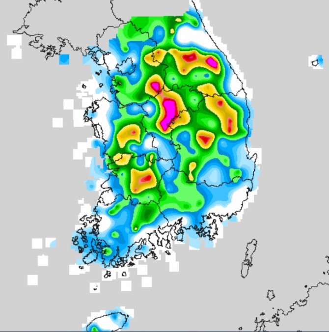 소나기에 의한 예상 강수량은 25일 오후(15~18시) 중부내륙(충남 제외): 5~30mm, 제주도(26일 밤(24시)까지): 30~80mm(많은 곳 120mm 이상), 강원영동(25일 오후(18시)까지), 북한: 5~40mm, 전라도, 경남남해안: 5mm 내외 등이다. 현재(04시), 중부지방은 맑고, 남부지방은 구름많은 날씨를 보이고 있으며, 제주도는 비가 오는 곳이 있다.