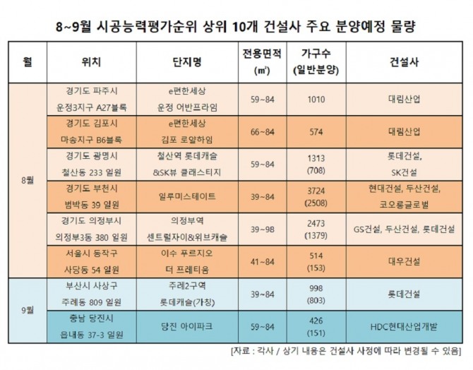 시공능력평가순위 톱10 건설사 8~9월 일반분양 23개 단지 1만8394가구 공급