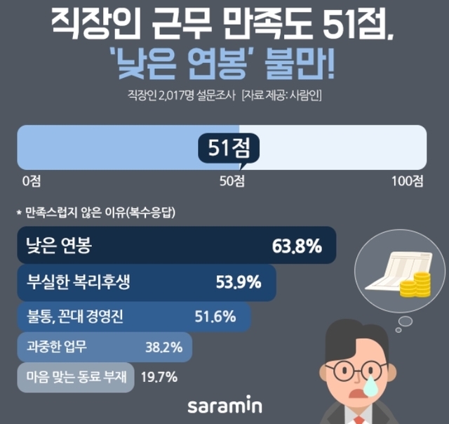 근무 만족도를 ‘점수화’하면 평균 51점으로 낙제점인 것으로 분석됐다.