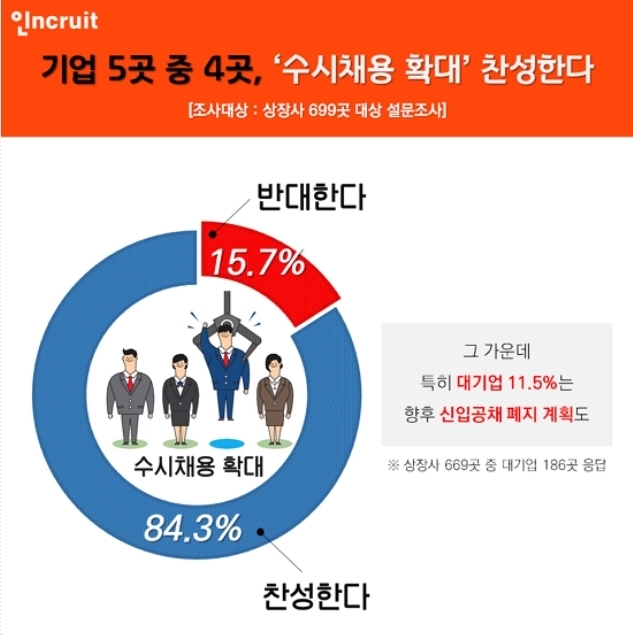 3일 취업포털 인크루트가 669개 상장기업을 대상으로 ‘2019년 하반기 대졸 신입사원 수시채용’에 대한 설문 결과, 84.3%가 신입사원 수시 채용에 찬성했다.