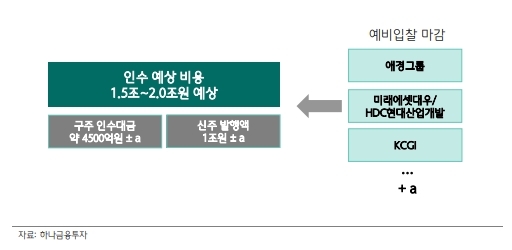 채동욱 하나금융투자 연구원은 "HDC현대산업은 인수전을 끝까지 치른다면 약 5000억 원~1조 원 수준의 투자가 예상된다”며 “최근 분양가상한제 등으로 주택사업에 대한 전망이 안좋게 바뀌는 가운데 인수추진선택에 대해 주가가 급락하며 시장이 냉정한 판단을 내린 것으로 보인다”고 평가했다.