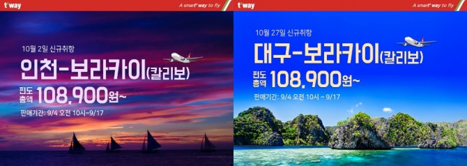 아울러 티웨이항공은 4일부터 17일까지 인천·대구-보라카이 노선 신규 취항 기념 특가 이벤트도 실시한다. 두 노선 모두 편도총액 기준 10만8900원부터 판매한다. 탑승기간은 인천-보라카이 노선 10월2일부터 10월26일까지, 대구-보라카이 노선 10월27일부터 내년 3월28일까지다.