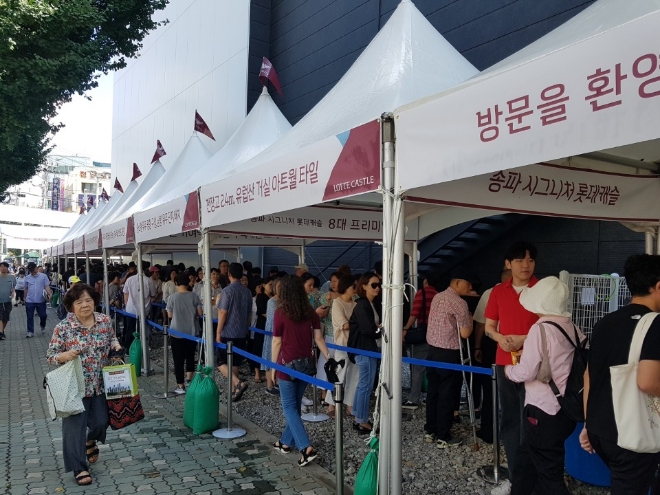 지난달 30일 '송파 시그니처 롯데캐슬' 모델하우스를 찾은 방문객들이 견본주택 입장을 위해 대기하고 있다. 사진=글로벌이코노믹 김하수기자