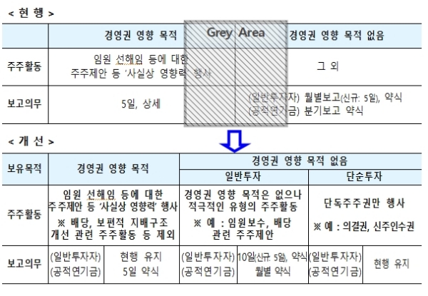 이번 개선안의 핵심은 5일 이내 상세보고 대상인 ‘경영권에 영향을 주기 위한 것’의 범위를 명확화하고 일부 축소했다.