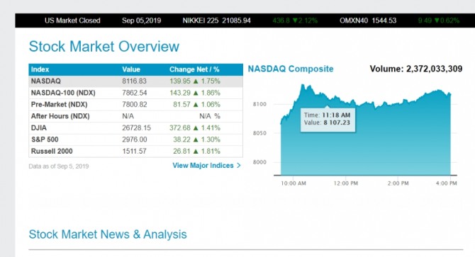 뉴욕증시에서 주요 지수는 5일 미국과 중국이 오는 10월 무역 회담을 열기로 한 데 힘입어 상승했다.