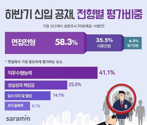 9일 취업포털 사람인이 263개 기업을 대상으로 하반기 전형별 채용평가 비중을 조사한 결과 면접전형이 58%를 차지했다.