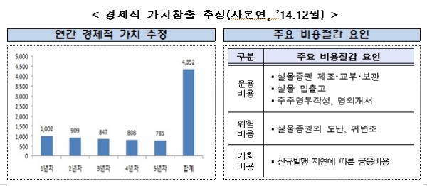 금융위 관계자는 “제도 시행 후 5년간 최대 9045억 원의 경제가치가 창출될 것으로 추정된다”며 “실물증권의 비효율을 제거되고, 자본시장의 혁신이 촉진될 것”이라고 말했다.