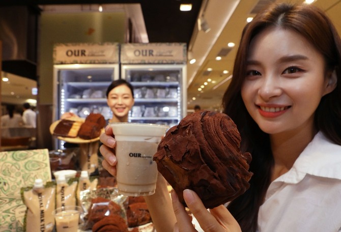 이미지 확대보기롯데백화점은 ‘아우어 베이커리’에서 가장 인기 있는 빵인 ‘더티초코(4700원)’ 와 ‘빨미까레(3900원)’를 냉동∙규격화 시켜 판매한다. 또 인기 음료인 ‘아우어에어(5500원)’와 ‘로열밀크티(5300원)’도 함께 판매한다.