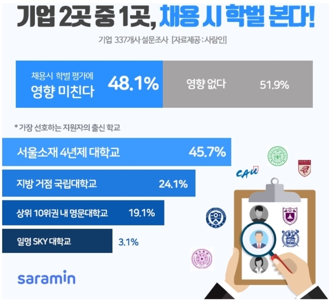 17일 구인구직 매칭 플랫폼 사람인이 337개 기업을 대상으로 ‘좋은 학벌이 채용 평가에 영향을 미치는지 여부’를 조사한 결과, 48.1%가 ‘좋은 학벌이 채용 평가에 영향을 미친다’고 밝힌 것으로 나타났다.