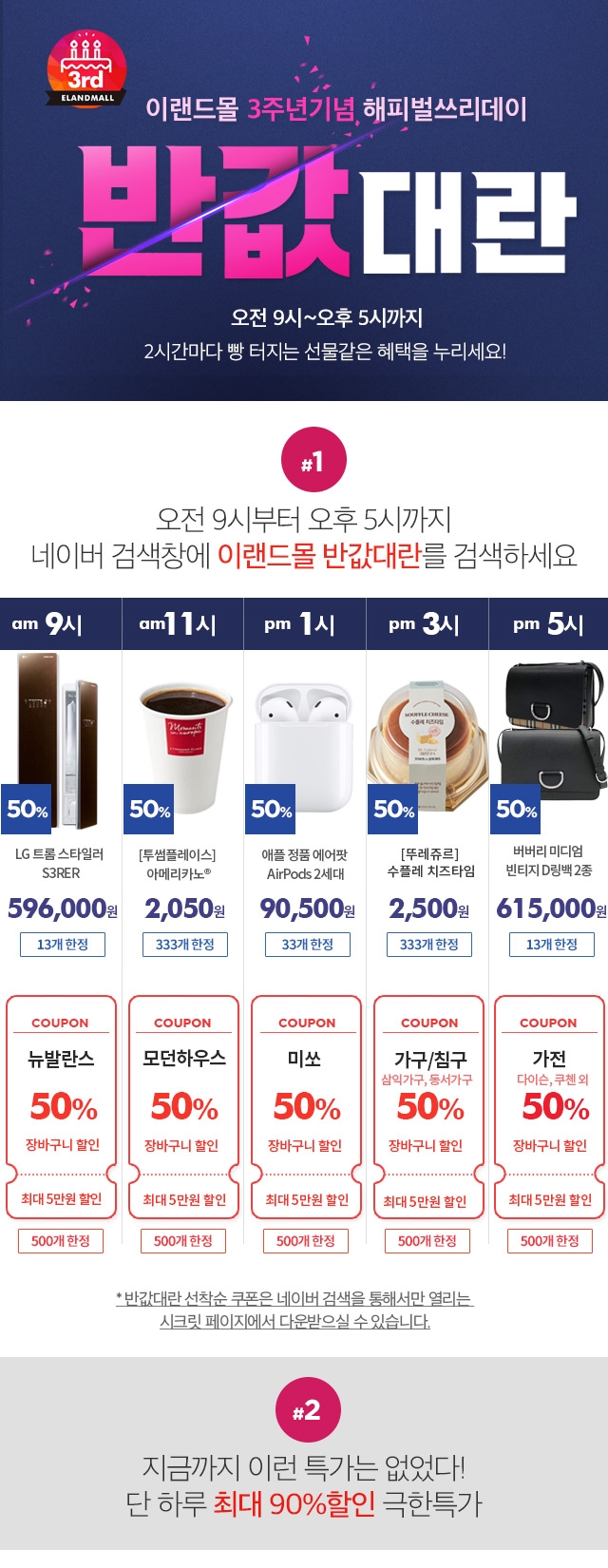 LG 스타일러·에어팟2 등 가전·IT기기·먹거리 등 반값특가…시간대별 기획전 반값쿠폰도 제공