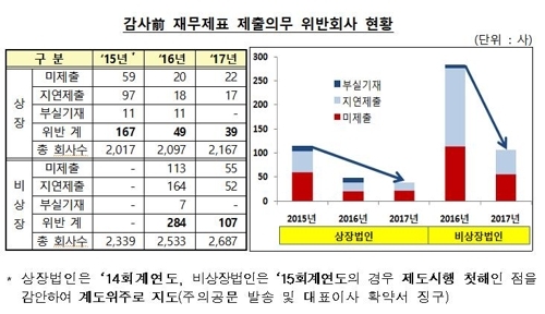 금감원은 "구체적인 위반 사유를 분석한 결과 상장기업은 주로 제출기한 착오가 많고 비상장기업은 제출 대상인지를 인식하지 못한 경우도 적지 않았다"고 했다.