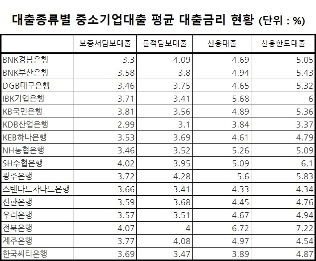또 산업은행은 신용대출에서 평균금리 3.84%, 신용한도대출에서 3.37%로 가장 낮은 금리를 기록했다.