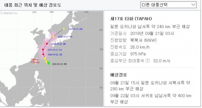 기상청은 21일 “태풍 타파는 20일 오후 3시 기준 일본 오키나와 남남서쪽 400㎞ 해상에서 시속 3㎞로 서북서진하고 있다”고 밝혔다.