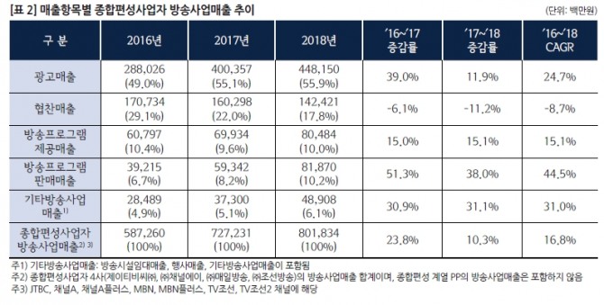 종편사업자의 방송사업매출 중 광고매출이 차지하는 비중은 꾸준히 증가해 2017년 처음으로 50% 이상을 차지했고, 지난해에도 전체 방송사업매출 대비 55.9%를 차지해 4482억 원을 기록했다.