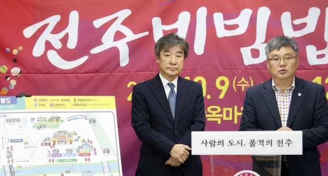 황권주 전주시 문화관광체육국장과 선기현 전주비빔밥축제조직위원장은 4일 시청 브리핑룸에서 기자간담회를 열고, 오는 9일부터 12일까지 4일간 전주한옥마을 및 향교일대에서 진행되는 ‘2019 전주비빔밥축제’의 주요프로그램과 올해 축제의 특징 등에 대해 설명했다.