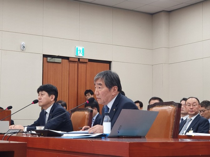 윤석헌 금융감독원장이 8일 국회 정무위원회 국정감사에 피감기관장으로서 참여해 국회의원들의 질의에 답하고 있다.   사진=이효정 기자 이미지 확대보기