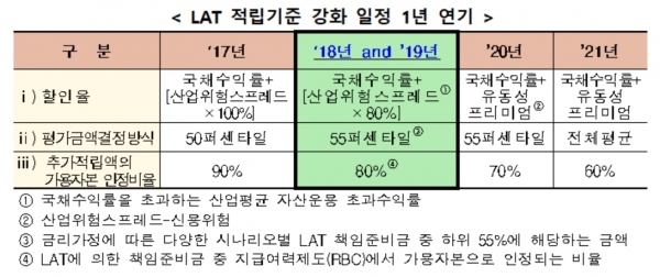 LAT란 결산 시점의 할인율 등을 반영해 보험사의 부채를 재산출한 뒤 이 값이 현행 부채보다 크면 책임준비금(보험 부채)을 추가로 적립하도록 하는 제도다. 이자율이 떨어지면 LAT 책임준비금 추가 적립액이 늘어 당기 비용도 늘게 된다.
