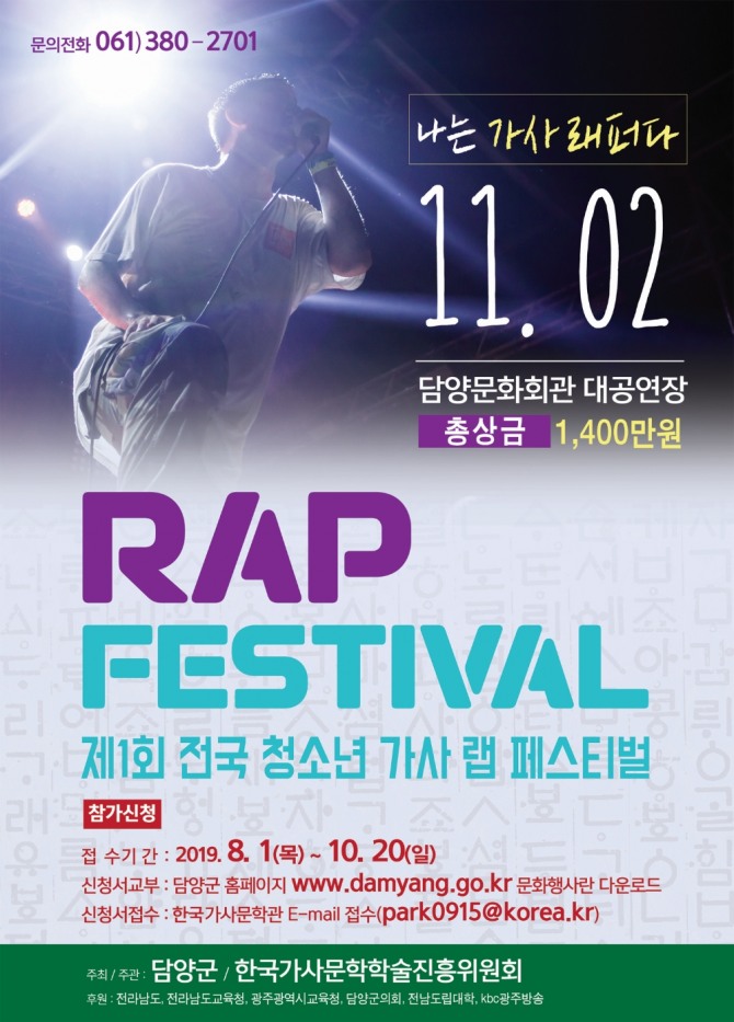 이미지 확대보기전남 담양군(군수 최형식)은 ‘나는 가사 래퍼다’라는 주제로 제1회 전국 청소년 랩 페스티벌이 11월 2일 담양문화회관 대공연장에서 개최한다고 10일 밝혔다.