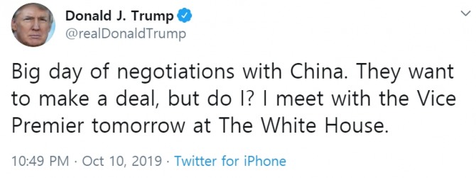 도널드 트럼프 미 대통령은 11일 트위터 계정에 글을 올려 "나는 내일 백악관에서 (류허) 부총리를 만날 것"이라고 밝혔다. 트럼프 대통령은 트윗에서 또 "중국과의 협상의 중요한 날(Big day)"이라며 "그들은 합의하기를 원한다. 하지만, 나는?"이라고 말했다.