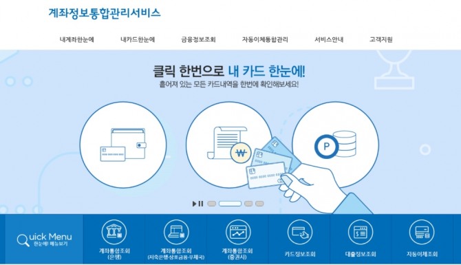 13일 신용카드업계와 금융당국 등에 따르면 지난해 도입된 '내 카드 한눈에'의 카드 정보조회 서비스는 신용카드를 보유한 국민 누구나 온라인으로 자신의 모든 신용카드 내역을 한번에 조회할 수 있는 통합조회 시스템이다.