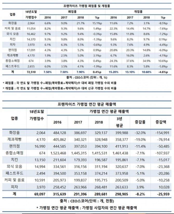 지난해 가맹점당 평균 매출액은 2억8969억 원, 폐점률은 7.9%로 각각 집계됐다.