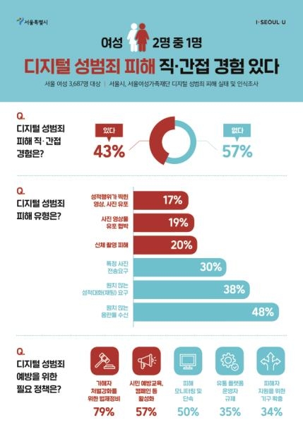서울시와 서울여성가족재단이 서울에 사는 여성 3678명을 대상으로 조사한 결과, '디지털 성범죄 피해를 직접 경험하거나 목격했다'는 응답자가 43%인 1581명에 달했다. 직접 피해자는 14%인 530명으로 나타났다.