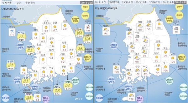 28일 오전 10시 기준 현재 기온은 ▲서울 -0.1도 ▲인천 1.6도 ▲수원 0.5도 ▲춘천 -4.7도 ▲강릉 4도 ▲대전 -0.5도 ▲대구 -0.2도 ▲부산 4.7도 ▲광주 0.8도 ▲목포 2.5도 ▲제주 9.4도 ▲울릉도·독도 4도 등이다.