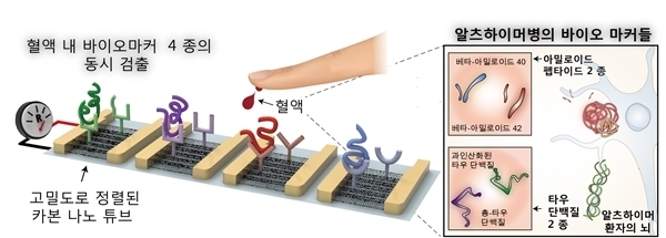 연구팀은 이런 고밀도 탄소 나노튜브를 이용해 혈액에 존재하는 알츠하이머병의 바이오마커 4종류를 동시에 측정할 수 있는 저항 센서 칩을 제작했다. 바이오마커는 정상 혹은 병적인 상태를 구분하거나 객관적으로 측정할 수 있는 몸 안의 단백질, DNA, RNA, 각종 대사물질을 의미한다.