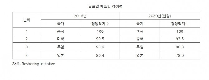 딜로이트와 미국 경쟁력위원회의 글로벌 제조업 경쟁력지수에 따르면 올해 미국은 중국을 제치고 제조업 경쟁력 1위를 탈환할 것으로 예상된다.