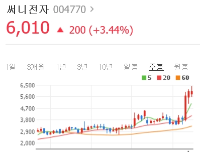 써니전자 주가는 지난 금요일 3% 올라 6010원에 장을 마감했다. 최근 긴조정을 마치고 주가가 상승랠리를 하고 있기 때문이다.