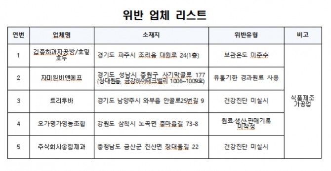 이미지 확대보기위반업체는 김종하과자공방·호밀호두, 자미원이앤에프, 트리투바, 오가명가영농조합, 주식회사 송림제과며 위반 내용은 건강진단 미실시(2곳), 유통기한 경과원료 사용(1곳), 원료·생산·판매기록 미작성(1곳), 보관온도 미준수(1곳)다. 식약처는 적발된 업체를 관할 지자체가 행정처분하도록 조치했으며 3개월 이내에 재점검을 시행할 예정이다.