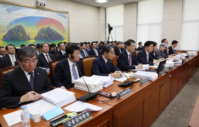 윤석헌 금융감독원장(왼쪽 앞줄 첫번째)이 국회 정무위원회 업무보고에 참석해 관련 자료를 살펴보고 있다. 사진=뉴시스