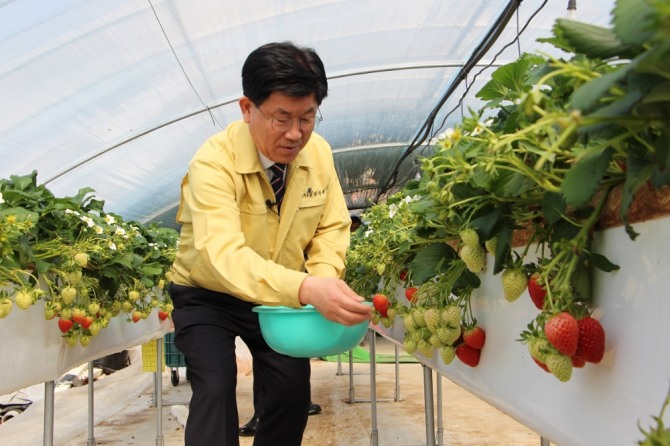 강인규 전남 나주시장은 20일 오전 남평읍 풍림리 소재 딸기 재배 농가를 방문, 직원들과 함께 딸기 수확에 직접 참여하며 농가 애로사항을 청취했다. /전남 나주시=제공