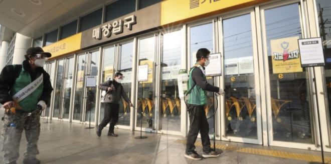 신종 코로나바이러스 감염증(코로나19) 40번 확진자가 다녀간 것으로 확인된 서울 성동구 이마트 성수점이 20일 오후 임시휴점에 들어간 후 방역을 하고 있다. 사진=뉴시스