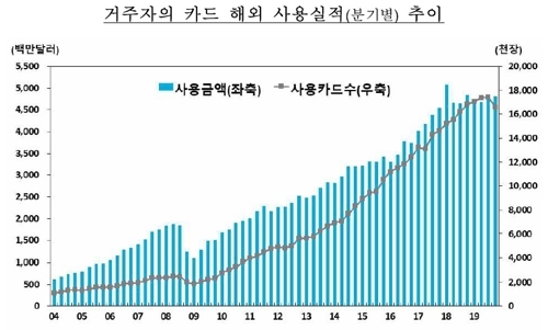 21일 한국은행이 발표한 '2019년 중 거주자의 카드 해외사용 실적'에 따르면 지난해 내국인이 해외에서 카드로 사용한 금액은 189억 달러로 전년보다 3억2000만 달러 줄었다.