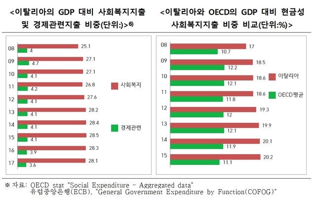 2008년 이탈리아 GDP의 25.1%를 차지한 사회복지지출 2017년 28.1%로 증가했다.
