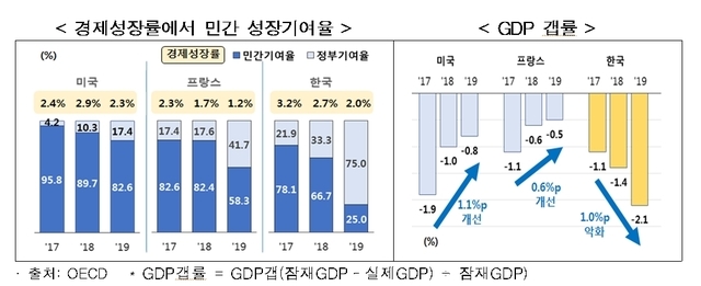 2017∼2019년 미국의 민간 성장 기여율은 95.8%에서 82.6%로 프랑스는 82.6%에서 58.3%로 하락한 반면, 한국은 78.1%에서 25%로 대폭 떨어졌다.