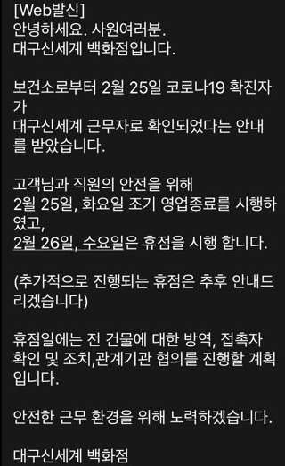 신세계백화점 대구점은 25일 이 직원에 대한 보건당국의 코로나19 검사 결과가 확진으로 나온 직후 오후 7시 매장을 조기 폐점하고 직원들도 즉시 귀가조치했다.