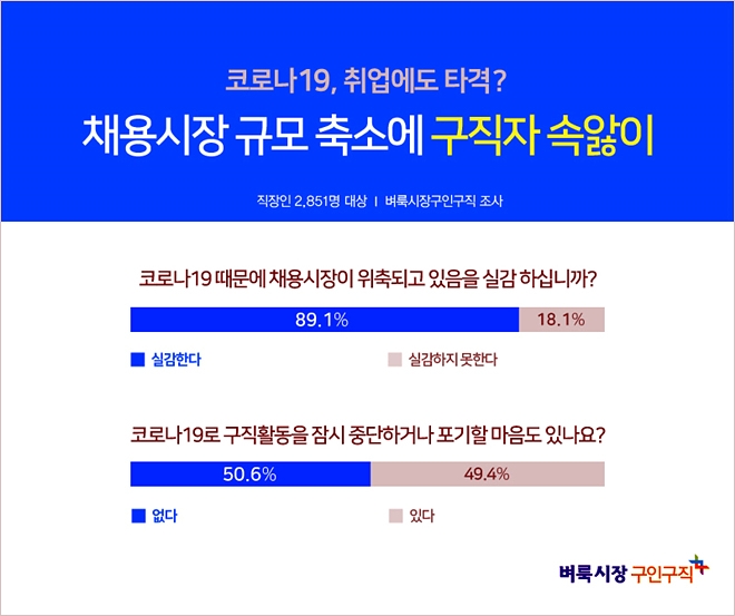 생활 밀착 일자리를 제공하는 벼룩시장구인구직이 구직자 2851명을 대상으로 코로나19의 여파로 채용 시장이 위축되고 있음을 실감하고 있는지에 대해 설문한 결과 81.9%가 ‘실감한다’고 답했다.