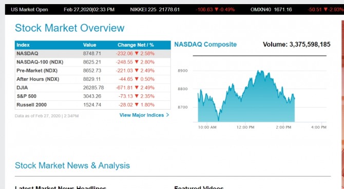 미국 뉴욕증시가 또 급락세다. 미국 내에서 감염 경로가 불확실한 신종 코로나바이러스 감염증(코로나19) 환자가 발생하면서 미국 역시 팬데믹(세계적 대유행)의 안전지대가 아니라는 우려가 나오면서 뉴욕증시가 ㅂ비틀거리고 있다.