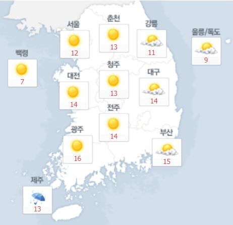 30일은 낮부터 전국에 구름이 낀다. 기온은 서울 13도, 부산 14도, 광주 16도, 대구 14도 등 전날과 비슷한 수준을 유지하겠다. 단, 춘천·강릉 등 일부 지역에서는 비 소식이 있다.