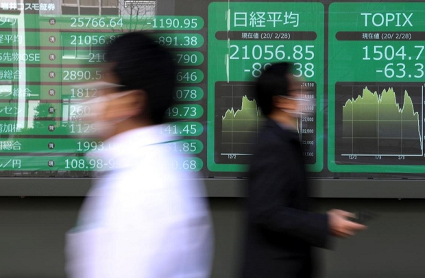 코로나 19 확산영향으로 급락한 지수를 보여주고 있는 일본 도쿄시내 증권사의 전광판 모습. 사진=로이터이미지 확대보기