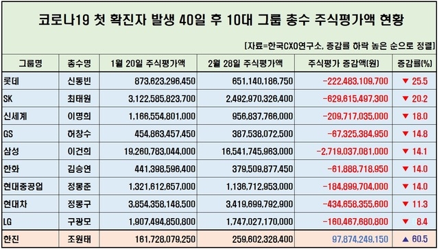 2일 기업분석 전문 한국CXO연구소에 따르면 10대 그룹 총수의 주식재산은 첫 확진자가 발생한 1월 20일 32조5650억 원에서 40일 후인 지난달 28일 현재 27조9727억 원으로 14.1%, 4조5922억 원 감소한 것으로 집계됐다.