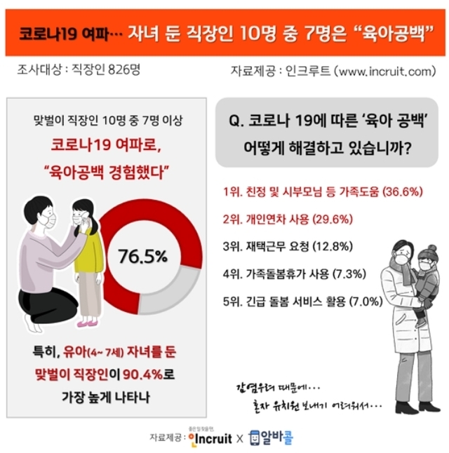 취업포털 인크루트(대표 서미영)와 바로면접 알바앱 알바콜이 2일 직장인 826명을 대상으로 ‘코로나 19에 따른 맞벌이 직장인 자녀돌봄 실태’를 설문한 결과, 육아공백을 경험한 비율이 76.5%에 달하는 것으로 나타났다.