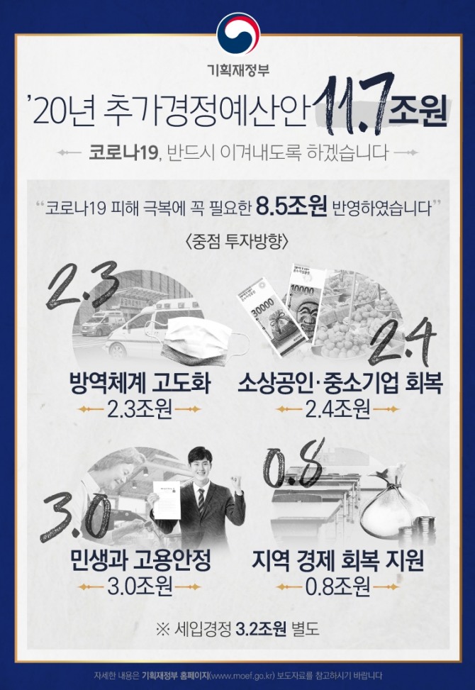 11조7000억 원에 달하는 이번 추경안은 세출 확대분 8조5000억 원에 부족한 세수를 메우기 위한 세입 경정분 3조2000억 원으로 구성됐다.