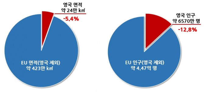 - 영국은 EU 전체 면적에서 약 5.4%를 차지하고 전체 인구에서는 12.8%를 차지