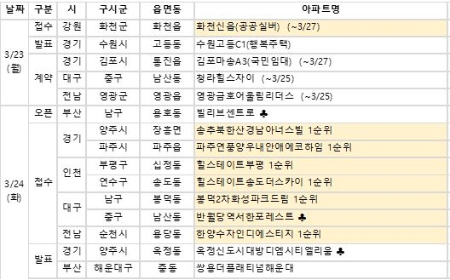 이미지 확대보기21일 부동산114에 따르면 3월 넷째 주에는 전국 11개 단지에서 총 7546가구(일반분양 6180가구)의 청약 접수가 진행된다. 당첨자 발표는 10곳, 계약은 9곳에서 진행되며, 견본주택은 11개 사업장에서 개관을 준비 중이다.