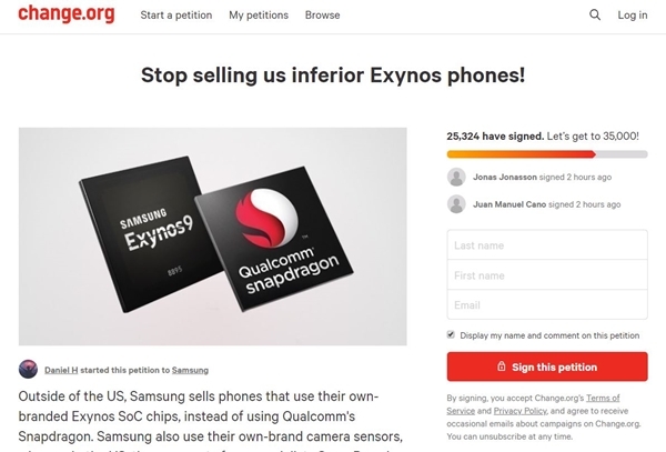 이미지 확대보기25일 업계에 따르면, 온라인 서명운동 플랫폼 체인지닷오알지(change.org)에는 삼성전자의 플래그십 스마트폰에 엑시노스 칩셋을 사용 중단하라는 청원글이 올라왔다. 해당 청원엔 현재 2만 5000명 이상이 서명한 상태다.