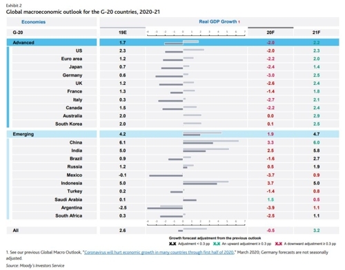 무디스는 이와 함께 올해 G20 국가의 성장률 전망치를 ‘마이너스’ 0.5%로 제시했다.