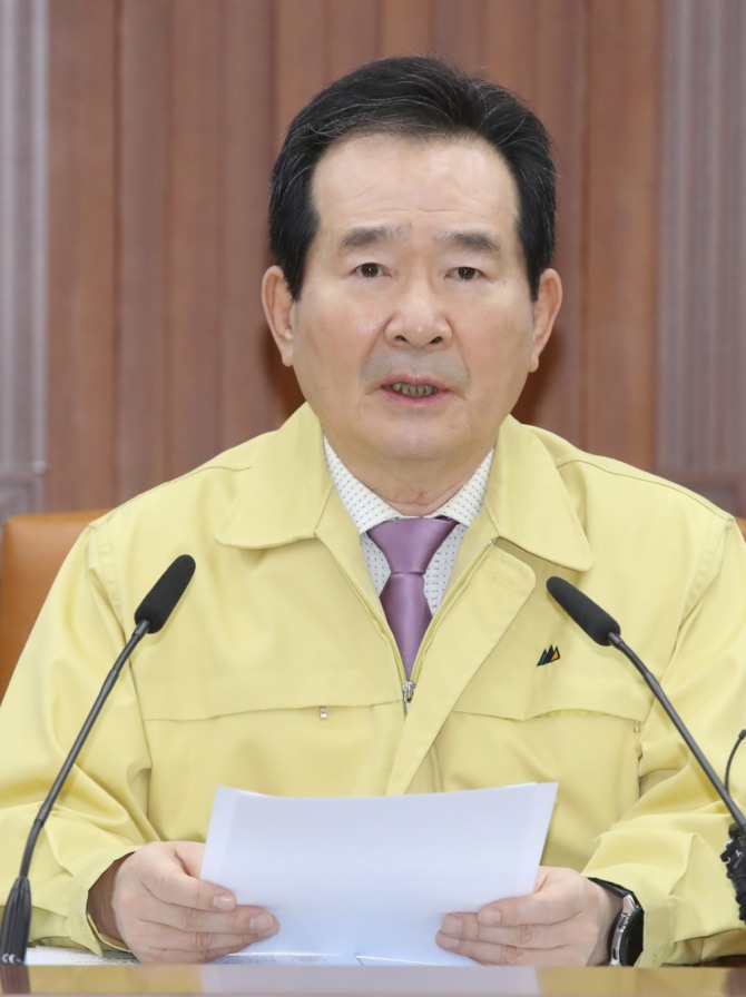 정세균 국무총리가 신종 코로나바이러스 감염증(코로나19) 관련 브리핑을 하고 있다.사진=뉴시스